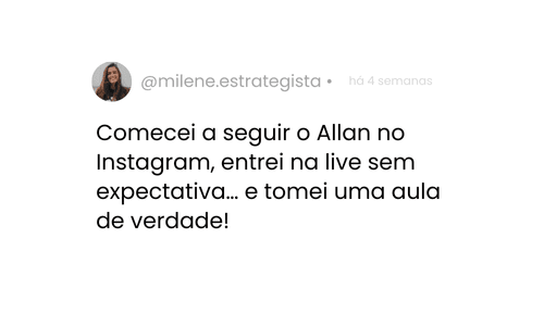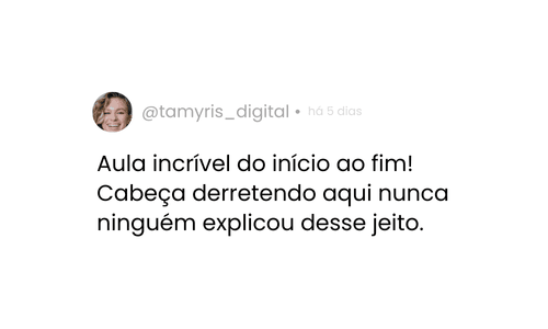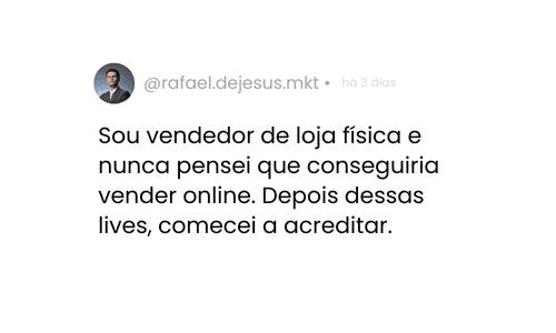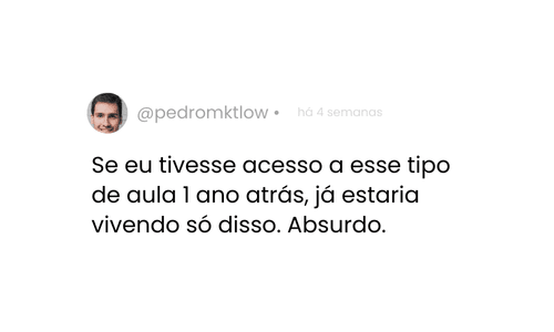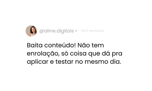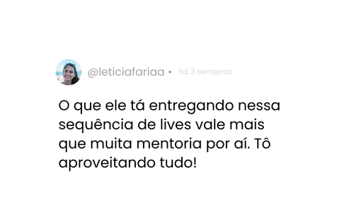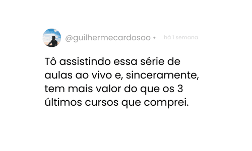 As aulas ao vivo acontecem toda quinta-feira, às 20h, e são a oportunidade perfeita pra você interagir, tirar dúvidas e aplicar o conteúdo primeiro que todo mundo. Se inscreva para ser notificado e receber os materiais em primeira mão.